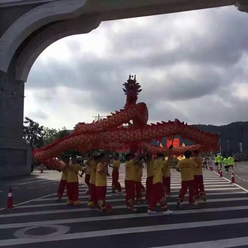 舞龍(dragon dance)的“龍”,通常都安頓在當地的龍王廟中,舞龍之日,以旌旗、鑼鼓、號角為前導,將龍身從廟中請出來,接上龍頭龍尾,舉行點睛典禮。龍身用竹扎成圓龍狀,節節相連,外面覆罩畫有龍鱗的巨幅紅布,每隔5、6尺有一人掌竿,首尾相距約莫有十數來丈長。龍前由一人持竿領前,竿頂豎一巨球,作為引導。舞時,巨球前后左右四周搖擺,龍首作搶球狀,引起龍身游走飛動。